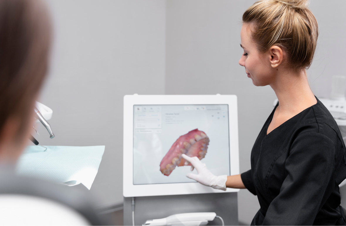 Scanarea intraorală este o metodă modernă de investigare și diagnostic, care utilizează un dispozitiv digital pentru a realiza o imagine 3D precisă a dinților și a cavității orale. Această tehnologie înlocuiește amprentele clasice cu materiale, eliminând disconfortul și oferind rezultate mult mai detaliate. Scanarea este utilizată în numeroase situații clinice: planuri de tratament ortodontic, realizarea coroanelor, punților sau fațetelor, precum și în implantologie.